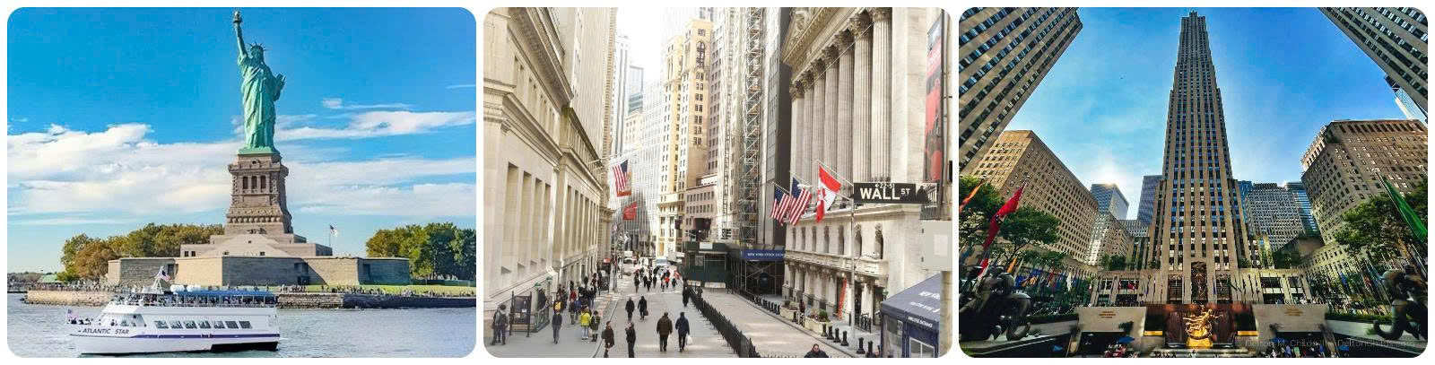 - Phố tài chính Wall Street - Nơi tọa lạc của sàn giao dịch chứng khoán New York và các trung tâm tài chính ngân hàng.