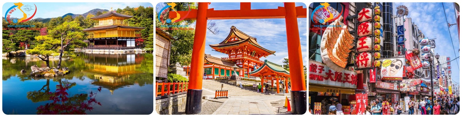 • Tham quan chùa Vàng Kinkakuji Là một trong những di sản văn hóa nổi bật nhất tại Kyoto, Nhật Bản. Được biết đến với sự lộng lẫy và tráng lệ, chùa Vàng Kinkakuji tỏa sáng bởi hai tầng trên cùng được phủ lớp vàng lá bóng loáng rực rỡ, biểu trưng cho nghệ thuật kiến trúc độc đáo và lịch sử phong phú của Nhật Bản