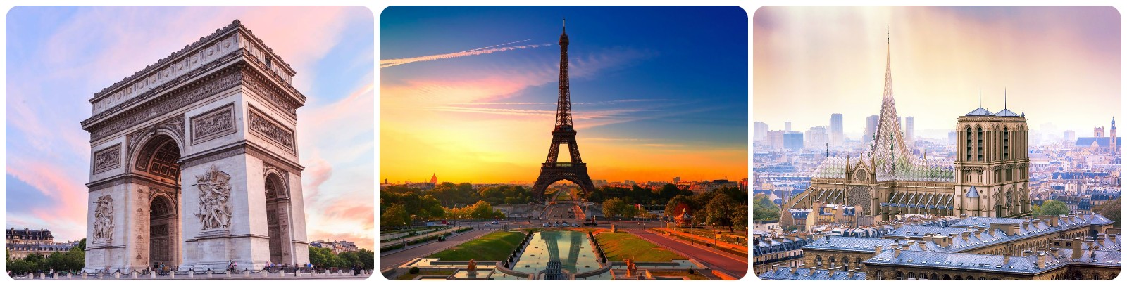 - Arc De Triomphe – Khải Hoàn Môn - Là một công trình kiến trúc biểu tượng cho lịch sử nước Pháp, cổng vòm này luôn sừng sững tráng lệ giữa thành phố với kiến trúc vòm độc đáo. Tại Khải Hoàn Môn còn khắc tên của hàng trăm Danh Tướng đã điều khiển Đại Quân Pháp trong các chiến công của thời đại Napoléon.